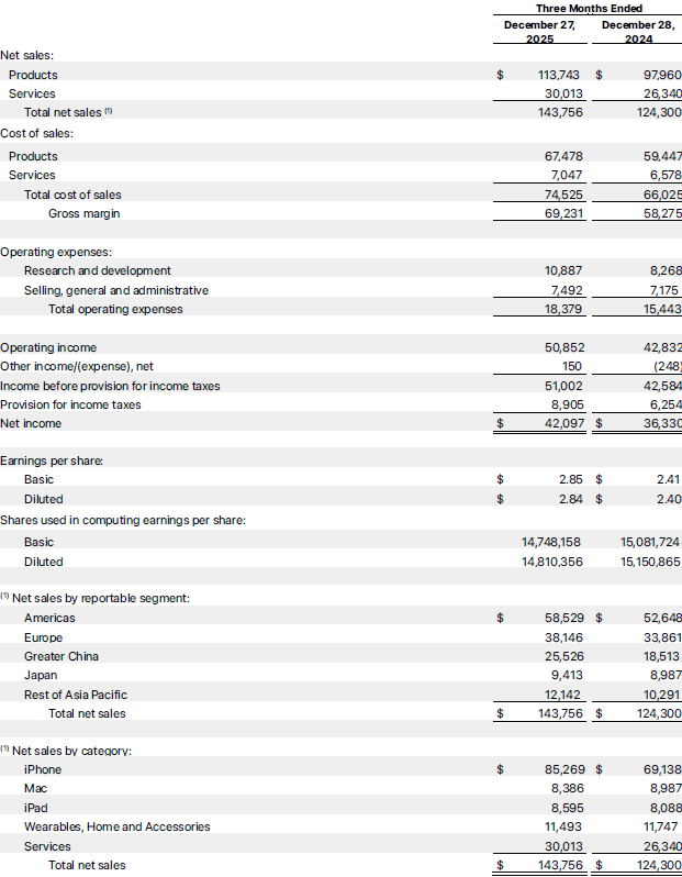 В сегменте носимых и домашних устройств выручка Apple в прошлом квартале сократилась на 2,2 % до $11,5 млрд, поскольку росту выручки препятствовал дефицит наушников AirPods Pro 3. Сегмент Mac просел по выручке на 6,7 % до $8,4 млрд, а вот планшеты iPad порадовали ростом на 6,3 % до $8,6 млрд. За четвёртый квартал компании удалось получить $51,6 млрд свободного денежного потока и вернуть около $32 млрд акционерам в виде дивидендов и выкупа акций. Всего Apple сейчас располагает около $145 млрд денежных средств и высоколиквидных активов. После завершения торгов акции Apple успели вырасти в цене на доли процента.