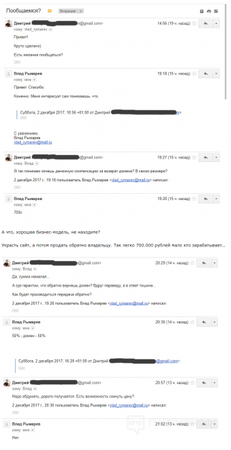 После того, как злодей получит доступ, он может перенести ваш домен или сменить владельца домена без проблем. Далее, когда доступ к сайту получен, на нем размещают свою рекламу, либо редиректят всех пользователей на свой сайт с такой же тематикой. Также возможен вариант вымогательства. Вот пример из практики, диалог со злодеем: