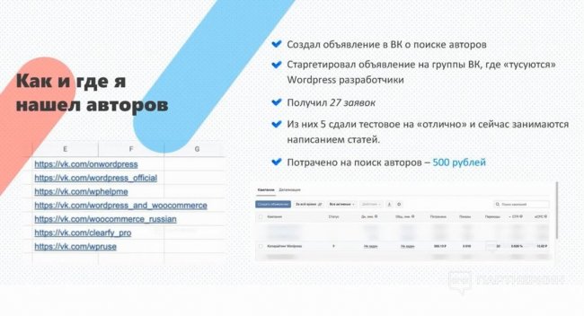 - Подбор авторов: объявление в ВК с таргетом на группы с разработчиками Wordpress. Итог — воронка из 27 заявок, на выходе 5 авторов. Для всех проведено тестирование, отобраны лучшие. Сумма за 1 000 символов — от 35 до 40 рублей;