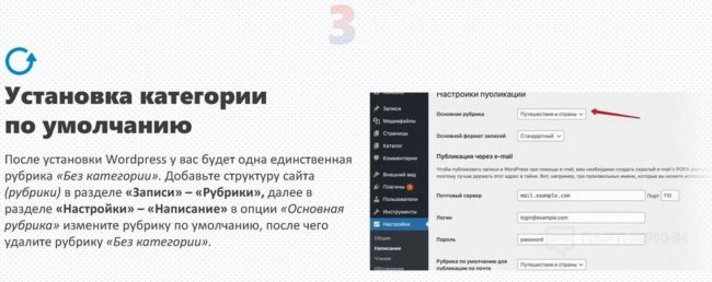 3. Установить категории по умолчанию. Продумайте структуру сайта (какие будут вкладки для навигации). Удалите рубрики без категорий, а основной рубрикой выберите основной раздел вашего сайта: