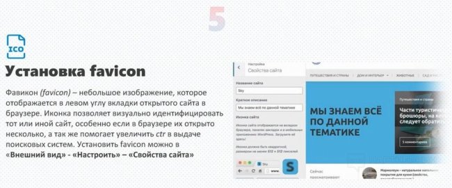 5. Установить favicon. Это иконка в браузере, рядом с названием вкладки. Помогает лучше индексировать сайт в поисковых системах и положительно влияет на CTR в выдаче.