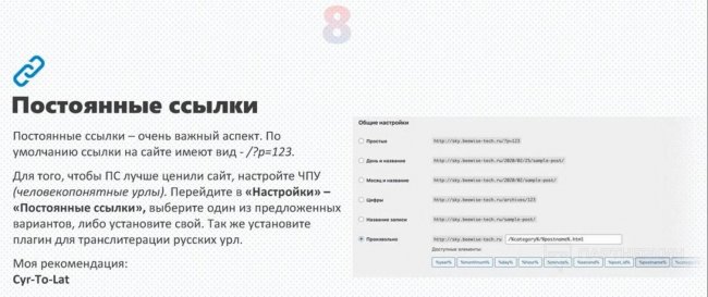 8. Постоянные ссылки. Это очень важный аспект. По умолчанию все ссылки на сайте имеют некрасивый вид. Чтобы поисковые системы лучше индексировали ваш сайт, нужно настроить читаемые ссылки. Перейдите в раздел Настройки — постоянные ссылки. Выберите предложенные варианты, либо установите свой.