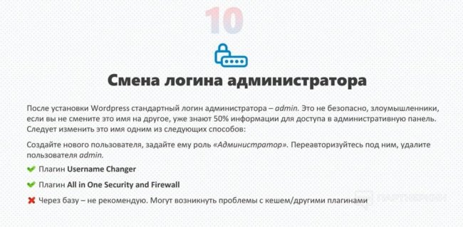 10. Сменить логина администратора. Очень важный пункт! Чтобы обезопасить сайт от злоумышленников. Рекомендуемые плагины: UsernameChanger, All in One Security and Firewall. Через базу не рекомендуется, могут возникнуть проблемы с кешем и другими плагинами.