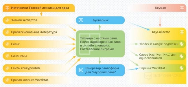 Эти 30 000 собирается из 1-1,5 млн ключевых слов, спарсенных изначально. Схема сбора базовых слов и парсинга: