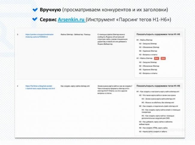 Ответ: выделяется «Плагины wordpress для создания HTML sitemap». Если проверить по другому инструменту «Выгрузка ТОП 10» на Арсенкине, то увидим, что в ТОП 10 нет таких запросов. В этом случае мы не будем включать это в структуру, либо писать по всем CMS. Этот интент лишний и нелогичный. Плюсы и минусы такого способа: