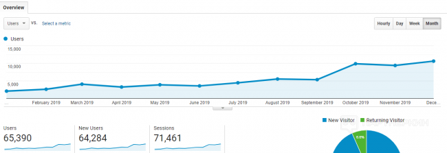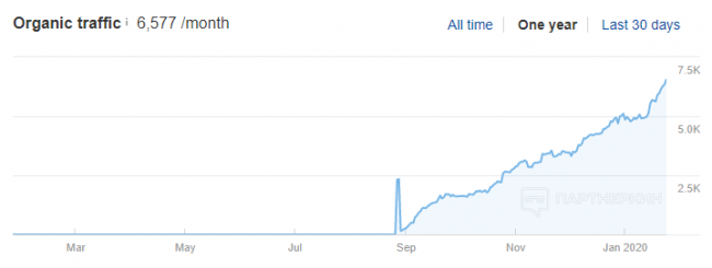В начале 2019 года трафик рос медленно и были некоторые взлеты и падения из-за апдейтов Google, но в целом трафик начал заметно расти в сентябре.