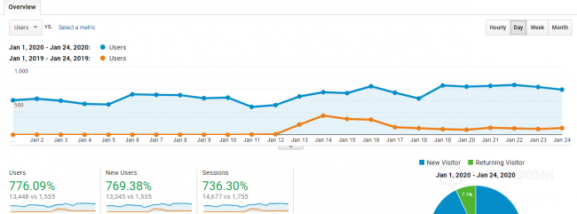 Ссылки и новый контент помогли увеличить трафик к началу 2019 года до 300 уников в день.