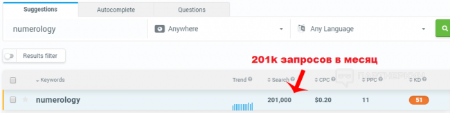 Как видите, каждый месяц более 200 000 человек вводят в поиск «нумерология».