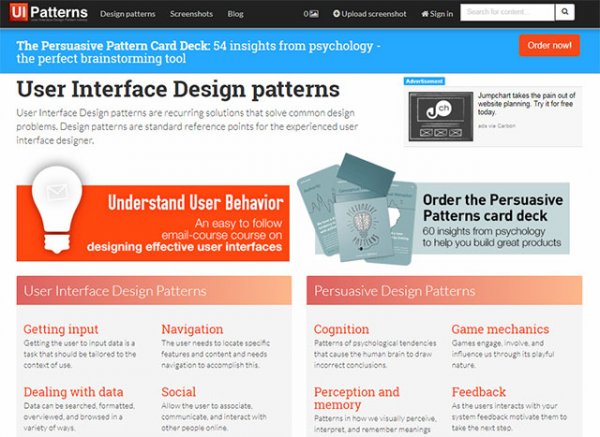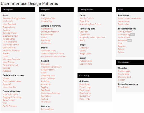 Как правило, для решения одних и тех же задач применяются похожие варианты реализации. Если глянуть на подборку наборов UI/UX плоского интерфейса, то увидите, что практически все традиционные «функции» в дизайне (поиск, кнопки, чекбоксы) имеют одинаковый принцип работы. Точно также и в более сложных решениях используется стандартизированный подход. В сервисе UI Patterns собраны наиболее актуальные паттерны дизайна.
