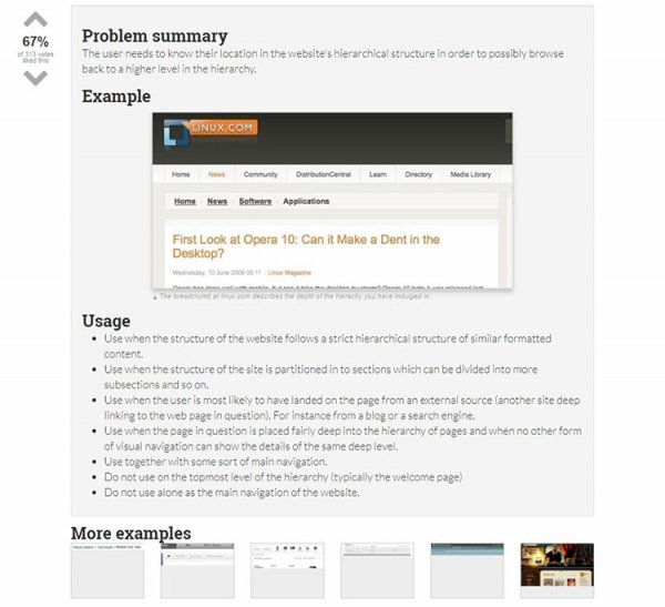 Эта информация поможет начинающим дизайнерам и проектировщикам понять зачем вообще был придуман текущий элемент и какую задачу он позволяет решать. Также здесь имеются описание вариантов реализации данного функционала, их обоснование, советы по внедрению + скриншоты. Кстати, некоторые картинки отсюда мы брали для статьи с примерами хлебных крошек на сайте. Дополнительно на странице есть комментарии, где можно обсуждать заметку и задавать вопросы.