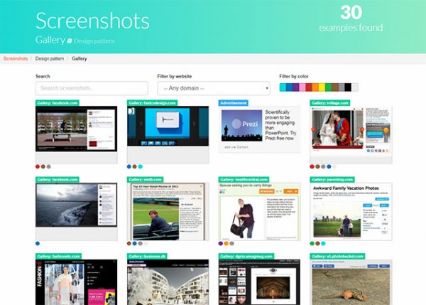 В фильтрах можно задавать цвет, домен либо вообще воспользоваться формой поиска. При переходе на страницу скриншота увидите его в оригинальном размере.
