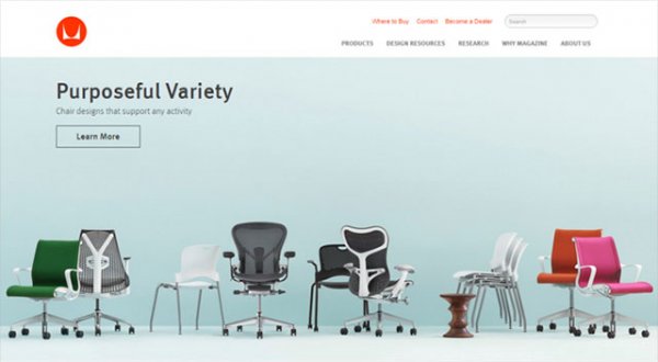 Бренд Hermann Miller больше всего известен своими стульями, поэтому основной акцент в дизайне мебельного сайта идет именно на них. Остальная продукция естественным образом представлена в схожей стилистике.