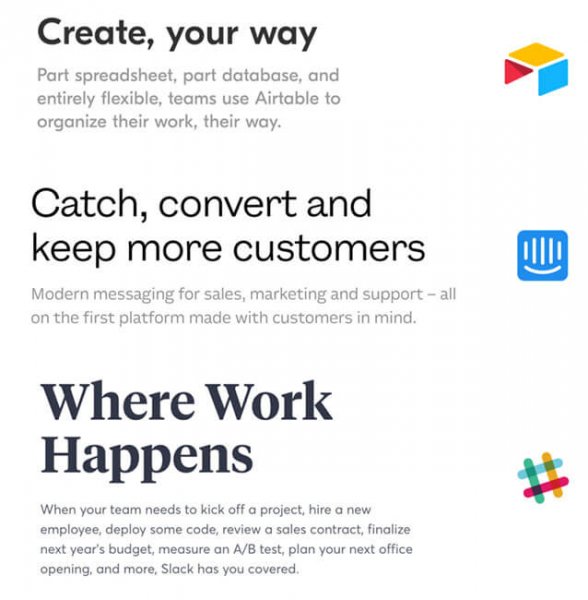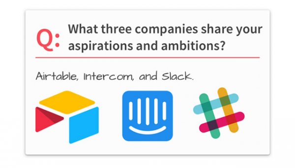 Пример №2. Допустим, ваша компания пытается решить проблему отсутствия общего средства коммуникации между разработчиками, дизайнерами и бизнесом. Если рассматривать данную сферу, то лидирующими проектами с похожими стремлениями и целями будут: Airtable, Intercom и Slack.