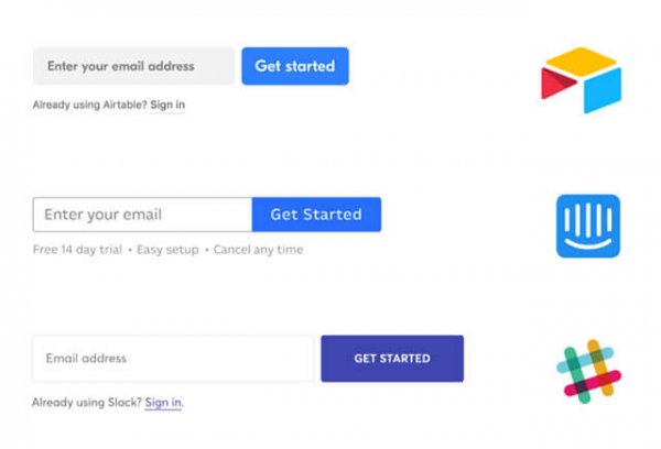 Это хороший подход. Он показывает как просто создать аккаунт и ускоряет процесс взаимодействия с пользователем. Особенно интересная реализация у Intercom — используется пространство под полем ввода email, чтобы подчеркнуть дополнительные полезные опции.
