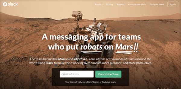 Корпоративный мессенджер Slack, разработавший приложение обмена сообщениями, в качестве главного изображения для дизайна лендинг пейдж выбрал фото марсохода.