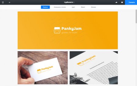 После выбора логотипа появится превью — на изображениях видно, как он будет смотреться на документах, визитках и т.д. Если вам нравится результат, переходите к оплате заказа. Для этого нажмите «Скачать» в правом верхнем углу экрана.