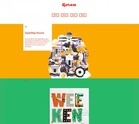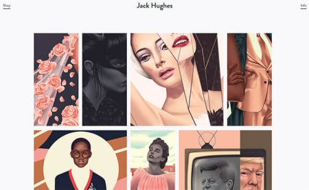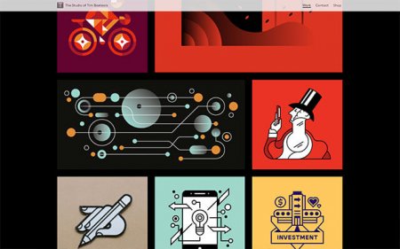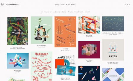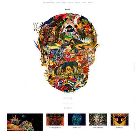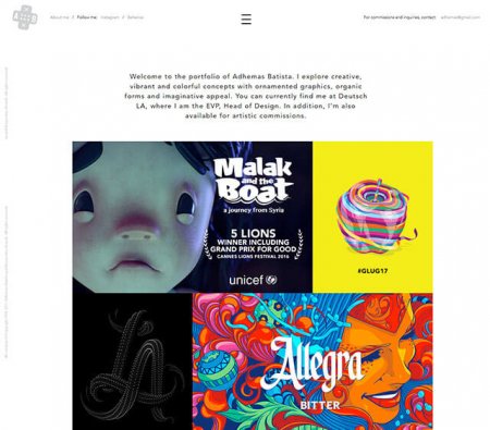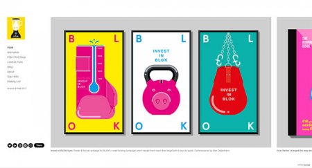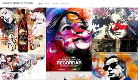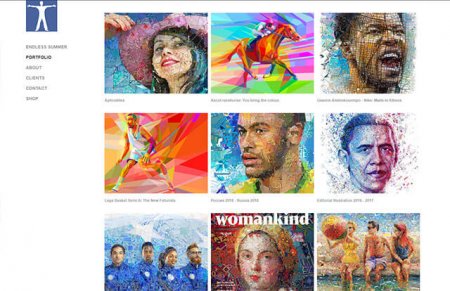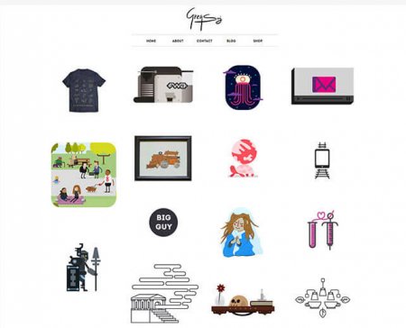 Исходя из этого, наиболее важная функция тут — галерея изображений с разбиением их по категориям. Чаще всего она реализована в виде сетки (Grid), но может быть и с горизонтальной прокруткой. Обязательно присутствуют страницы об авторе и контакты. Также в шапке или футере размещаются иконки-ссылки на аккаунты автора в соц.сетях — как профессиональные, так и личные: Behance, Linkedin, Dribbble, Facebook, Instagram и др. Время от времени на веб-сайтах встречаются разделы блогов и интернет-магазина: кто-то публикует личные заметки/фото, другие — продают картины или вещи со своими принтами.