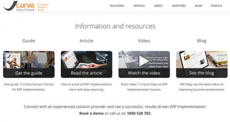 JCurve Solutions – агентство по планированию ресурсов предприятия (англ. Enterprise Resource Planning или ERP). На сайте компания сразу же обращается ко всем, кто рассматривает возможность внедрения ERP, с помощью призыва к действию, спрашивая: «Думаете о ERP?». Если не уверены в ответе, вам советуют скачать руководство с преимуществами JCurve. Эта традиционная практика при разработке дизайна лендингов может быть полезной и в нашей ситуации.