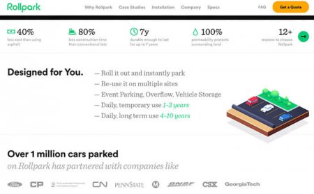 При входе на сайт потенциальным покупателям сразу показывается видео об актуальном продукте, подкрепленное хорошими показателями: долговечности, сроками строительства, стоимостью и др. Дизайнеры также использовали большие фотографии, которые ссылаются на тематические исследования, описывающие проблемы с парковкой, и возможное их решение от Rollpark.