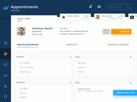 В этом примере представлен процесс взаимодействия доктора с пациентом в приложении HealthCare. При нажатии на кнопки открываются выпадающие списки дополнительных услуг, которые врач может включить в счет клиента. При выборе нужного варианта большая кнопка исчезает, остается лишь выбранная опция и маленькая кнопка-плюс на случай, если вы захотите еще раз просмотреть список.