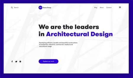 В изящном и минималистичном макете сайта строительной компании в левом левом нижнем углу находятся иконки корпоративных социальных аккаунтов. Они достаточно заметны, но при этом не отвлекают внимание от ключевой навигации и объекта с призывом к действию.