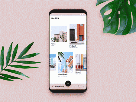 В этом примере для приложения Travelersdiary для взаимодействия имеются: панель управления в нижней части экрана, FAB-кнопка и прокручиваемый список.