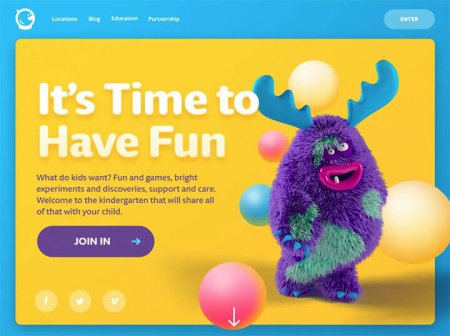 Основная Call To Action кнопка приглашает посетителей присоединиться, она мгновенно привлекает внимание: дизайнер использовал прямоугольную форму с закругленными краями. Яркий цвет кнопки контрастирует с фоном и визуально связывает ее с анимационным hero image изображением – самым заметным визуальным элементом на странице. Поддерживающий CTA-текст набран заглавными буквами и легко читаемым шрифтом.