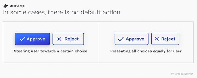 Исключение составляют те случаи, когда все варианты равны или когда определенное действие несет какую-нибудь опасность (обычно подсвечивается красным), и вы хотите, чтобы человек нажал на кнопку осознанно, а не на автомате.