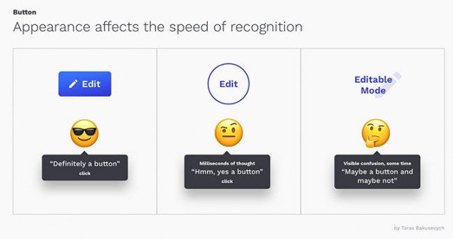 Не нужно создавать какие-то сложные головоломки или «лабиринты» в своих решениях. После многолетнего использования различных устройств и продуктов у нас формируется определенное ожидание того, как выглядят и функционируют кнопки. Если элементы в приложении или вебсайте будут существенно отличаться от этого ожидания, то это будет сбивать с толку.