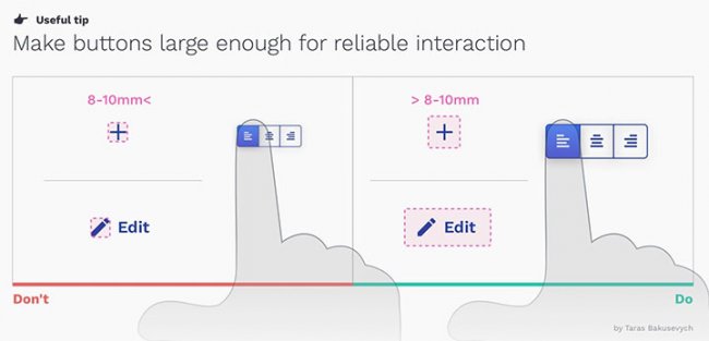 Для кнопок-иконок или пиктограмм для сайтов нужно обязательно позаботиться о том, чтобы мишень для нажатия выходила за пределы визуальных границ элемента. И это касается не только смартфонов или планшетов, но и устройств, где люди работают с помощью мышки.