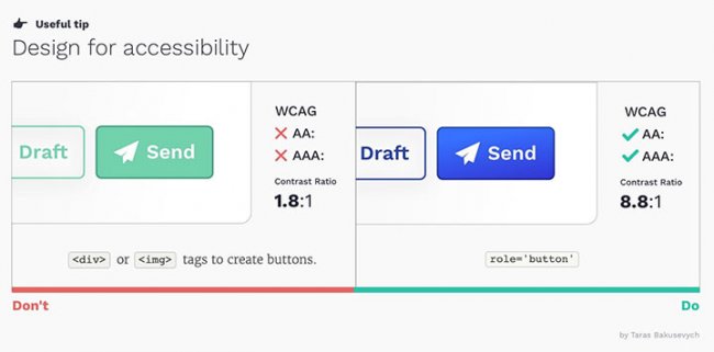 Дизайнеры должны тесно сотрудничать с командой разработчиков. Так как роль кнопки – обеспечить кликабельность элементов, то для ее создания лучше применять свойство role= «button», позволяющее распознавать элемент программой чтения с экрана.