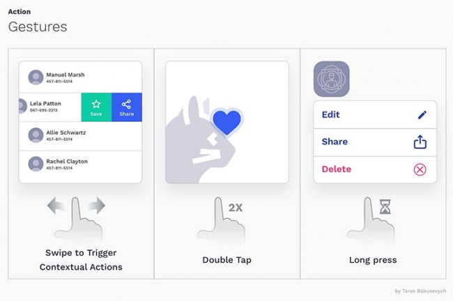 Жестовое управление позволяет пользователям взаимодействовать с приложением/сайтом с помощью сенсорного экрана. Сейчас в мобильном дизайне все чаще для действий используются такие жесты, как свайп, двойное или длительное нажатие. Такое управление лучше сделать в качестве альтернативного способа выполнения задачи для более продвинутых юзеров.