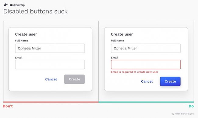 Наверное, все были в такой ситуации. Вы застряли на определенной странице и пытаетесь понять, почему вы не можете закончить процесс из-за деактивированной кнопки. Подобные решения используются для того, чтобы показать, что компонент в настоящее время не интерактивен, но может быть включен в будущем. Также кнопки отключают потому, что ее удаление из «родного» местоположения и появление позже может сбить с толку.
