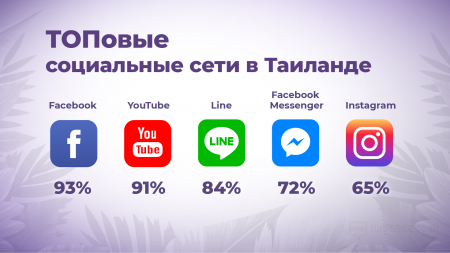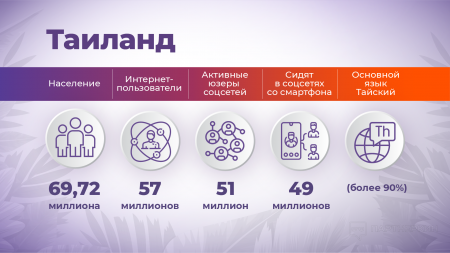 Количество активных аккаунтов в топовых социальных сетях в Таиланде на душу населения составляет 74% (51 млн. чел), в то время как средний мировой показатель составляет 45%.
