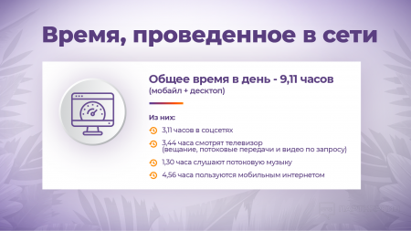 При этом 3,44 часа смотрят телевизор (вещание, потоковые передачи и видео по запросу) и 1,30 часа прослушивают потоковую музыку. На социальные сети у тайца уходит 3,11 часов в день. 4,56 часов в сутки таец сидит в сети с мобильного устройства.