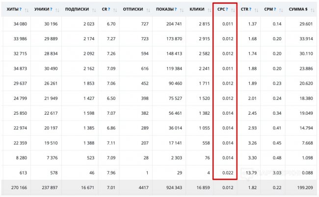 Единственный вариант держать цену клика – это каждый день наращивать трафик, а отсюда – и число новых подписок. Сегодня – 100, завтра – 200, послезавтра – 300 и т. д. Но это не всегда возможно. Получается, что если траф никак не растет, и каждый день одно и то же число подписок, то CPC будет падать – это факт и простая математика.